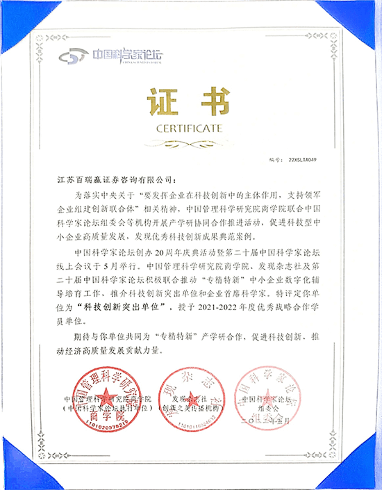 科技創(chuàng)新突出單位證書